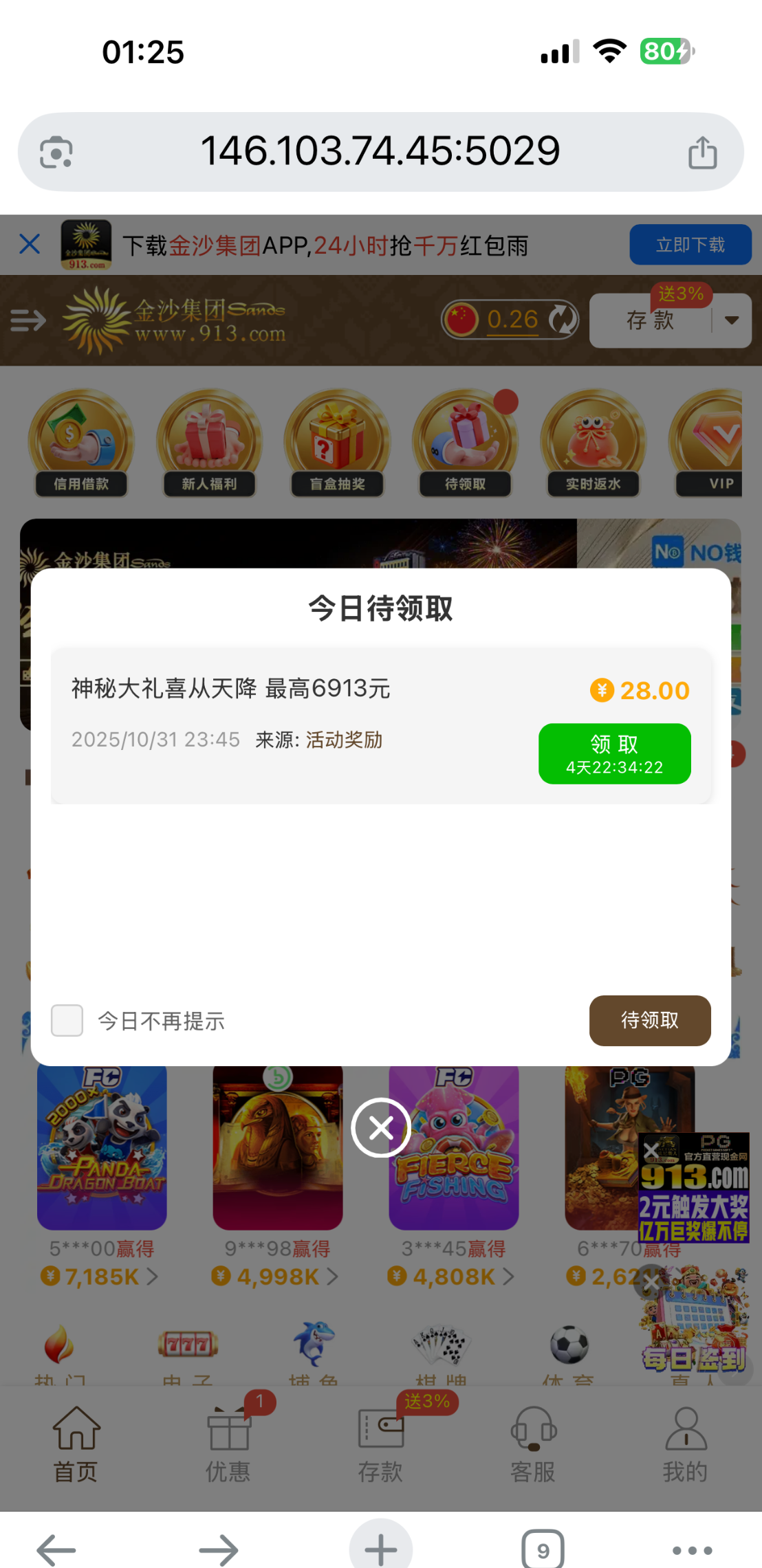 挂逼好久了 今天1号 我把账号都登入了一遍找白嫖 找到好几个 就这个最多 有号登入看看吧 913.com