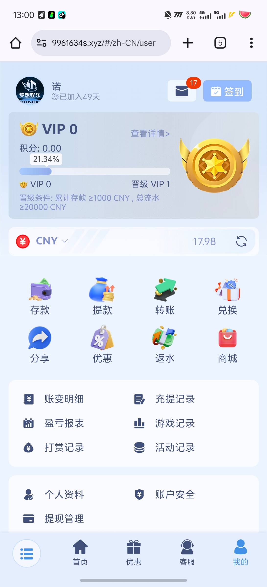 每周余额里留1块钱。每周一去,随便打一个1块注,等一个小时或者两个小时。去活动页面里。16.6链接:MT135.com