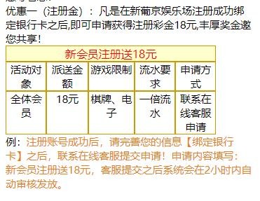 新用户注册绑卡 联系在线客服申请18元彩金 限制游玩电子棋牌 最低提款100元